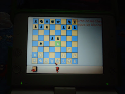 Despues de estar un par de semanas jugando contra el computador, Franco ha encontrado una forma de derrotarlo. No se si el nivel se pueda ajustar, pero navegando por las nuevas actividades para el olpc desde la el wiki, encontré gcompris chess.