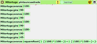 - Dibuja un cuadrado y su hipotenusa. Usa la fn raiz cuadrada incorporada en Etoys